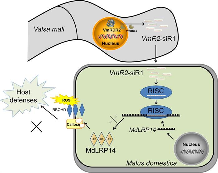 This study first discovered that V. mali has two homologous VmRDR1 and VmRDR2, both containing the conserved RdRP domain. After the deletion of VmRDR2, the pathogenicity of the pathogen was significantly reduced, and after the deletion of both VmRDR1 and VmRDR2, the pathogenicity was extremely reduced, indicating its crucial role in the infection process of V. mali. Subsequent sRNA sequencing analysis revealed that the deletion of VmRDR2 significantly reduced the sRNA abundance of the pathogen, especially affecting the generation of endogenous small interfering RNA (siRNA). Further analysis of the most significant VmR2-siR1 revealed that VmR2-siR1 positively regulates the pathogenicity of the pathogen, and degradome sequencing combined with related experiments found that VmR2-siR1 can specifically degrade the expression of the apple MdLRP14 gene. Further research found that overexpression of MdLRP14 can enhance apple resistance to V. mali, while the presence of VmR2-siR1 can inhibit this resistance. Additionally, silencing the MdLRP14 gene also reduces apple disease resistance. This study is the first to reveal how the canker pathogen utilizes RdRP in the RNAi pathway to suppress the host apple's defense response, providing a new perspective on understanding the role of cross-kingdom RNAi in plant-pathogen interactions and providing important scientific evidence for exploring the complex interactions between plants and pathogens.
