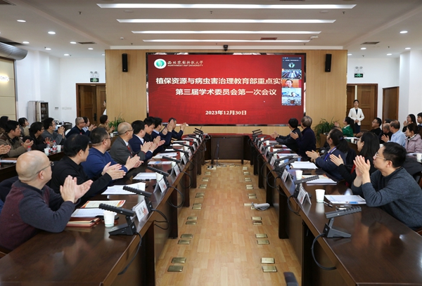 In order to improve the function of the laboratory, promote the development of plant protection disciplines, and better serve national strategies, on December 30th, 2023, the first meeting of the third academic committee of the Key Laboratory of the Ministry of Education in Plant Resources and Pest Management was held at our college.