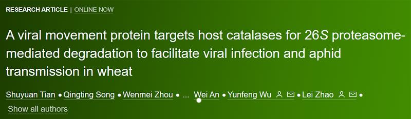On March 7th 2024, the Plant Virus and Viral Gene Engineering Technology Research Team from our college published an online research paper titled "A viral movement protein targets host catalases for 26S proteasome-mediated degradation to facilitate viral infection and aphid transmission in wheat" in the journal Molecular Plant. Tian Shuyuan, a Ph.D student of our college, is the first author of this paper. Prof. Wu Yunfeng and Associate Prof. Zhao Lei are the co-corresponding authors.