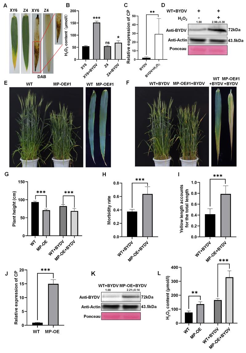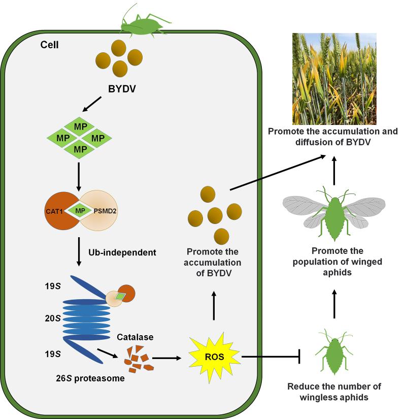 This study found that overexpression of the virus's Movement Protein (MP) significantly promotes the accumulation of ROS in wheat, leading to the appearance of yellow dwarf phenotypes. Conversely, to resist the expansion of virus infection, wheat utilizes its own TaCATs to suppress viral infection. In response, the virus overcomes the inhibition of TaCATs by promoting the interaction between the proteasome receptor protein PSMD2 and TaCAT1 through the 26S proteasome pathway, thereby facilitating the degradation of TaCATs. The degradation of TaCATs disrupts the ROS balance in wheat, leading to increased ROS levels. The elevated ROS levels promote the accumulation of BYDV while inhibiting the reproduction of vector aphids and promoting the production of winged aphids, which migrate to healthy wheat plants to initiate the next round of transmission.