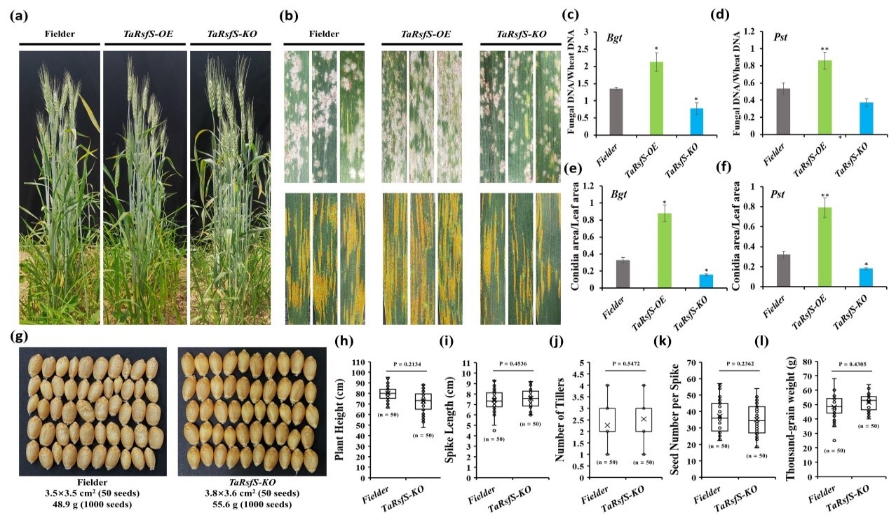 This study revealed the molecular mechanism by which wheat becomes susceptible to disease when infected by Blumeria graminis f. sp. tritici (Bgt) and Puccinia striiformis f. sp. tritici (Pst). Specifically, the ribosomal silencing factor TaRsfS forms a TaRsfS-TaOPR1 complex with 12-oxo-phytodienoic acid reductase 1 (OPR1), inhibiting the biosynthesis of jasmonic acid (JA) in the host.Powdery mildew and stripe rust are important diseases of wheat worldwide, and cultivating and planting resistant varieties is the most economical and effective prevention and control measure. Identifying potential target genes for precise improvement of crop resistance and elucidating the molecular mechanisms of resistance are of great significance for the durable control of diseases. The ribosomal silencing factor (RsfS) is a conserved protein encoded by almost all bacterial and eukaryotic genomes. It binds to the ribosomal large subunit 50S to inhibit the initiation stage of translation and participates in biological processes such as organism growth and development and stress response. However, the role of TaRsfS in plant response to biotic stress is still unclear.The study found that overexpressing TaRsfS significantly reduced wheat resistance to powdery mildew and stripe rust, while knocking out TaRsfS using CRISPR-Cas9 significantly enhanced wheat resistance, indicating that TaRsfS negatively regulates wheat resistance to these two diseases. Agricultural trait measurements at the adult plant stage showed that knocking out TaRsfS had no significant effect on the main agronomic traits of wheat (Figure 1). This suggests that TaRsfS can be used as a target gene for genetic improvement of wheat resistance to powdery mildew and stripe rust.