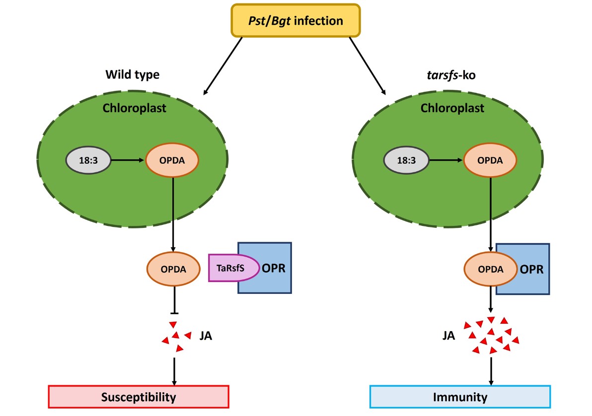 Figure 2. A schematic diagram of the negative regulation of wheat resistance to powdery mildew and stripe rust by the TaRsfS-TaOPR1 interaction