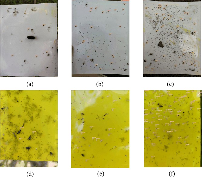 (a) Low-density A. lucorum; (b) Medium-density A. lucorum; (c) High-density A. lucorum; (d) Low-density Empoasca spp.; (e) Medium-density Empoasca spp.; (f) High-density Empoasca spp.