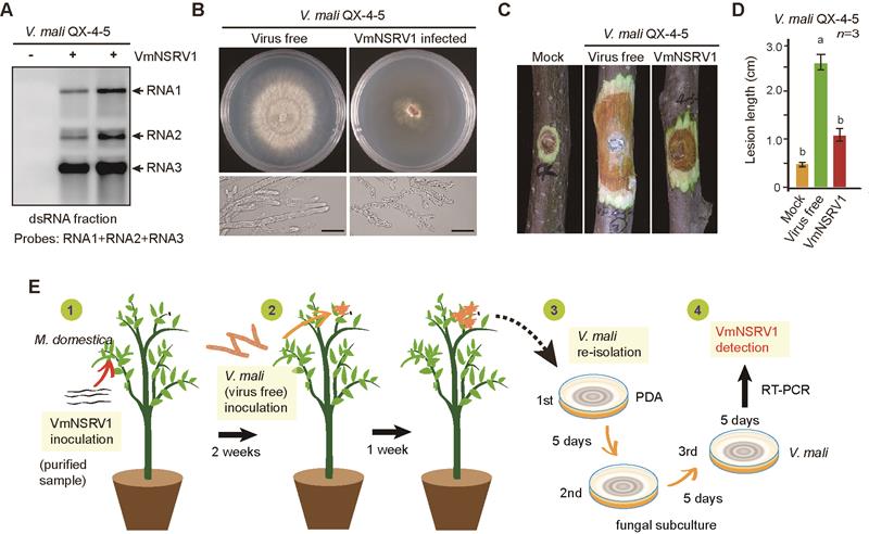 The novel fungal virus VmNSRV1 discovered in this study was isolated from the pathogenic fungus Valsa mali, which causes apple tree rot. VmNSRV1 can significantly reduce the pathogenicity of Valsa mali, making it a novel and highly effective biocontrol fungal virus. The VmNSRV1 genome contains three negative-strand RNA segments (RNA1, RNA2, RNA3), encoding the viral RNA-dependent RNA polymerase (RdRp), a movement-like protein (MP-L), and a nucleoprotein (N), respectively. Phylogenetic analysis based on the conserved structural domain of the viral RdRp revealed that VmNSRV1 is closely related to the Laulavirus genus within the Phenuiviridae family and is temporarily classified as a new member of this genus. Interestingly, VmNSRV1 RNA2 encodes an MP-L protein that can be localized to the plasmodesmata of plant cells and exhibits the function of plant virus movement proteins. The study found that VmNSRV1 can not only systematically infect plantsbut also transmit bidirectionally between plants and plant-related pathogenic fungi. Additionally, among 139 apple tree leaves tested in orchard experiments in Shaanxi Province, 24 were positive for VmNSRV1. This suggests that under natural conditions, VmNSRV1 exhibits cross-kingdom infection between plants and pathogenic fungi. Given its excellent biocontrol potential and extracellular transmission ability, the study invented a "biocontrol fungal virus" spraying technique, where fungal extracellularly secreted virus particles are directly sprayed onto infected plants, effectively inhibiting the expansion of apple tree rot lesions. Furthermore, the nucleocapsid N protein encoded by VmNSRV1 RNA3 is associated with lipid droplet metabolism in fungal and plant cells, which may be the key to its cross-kingdom infection of fungi and plants.