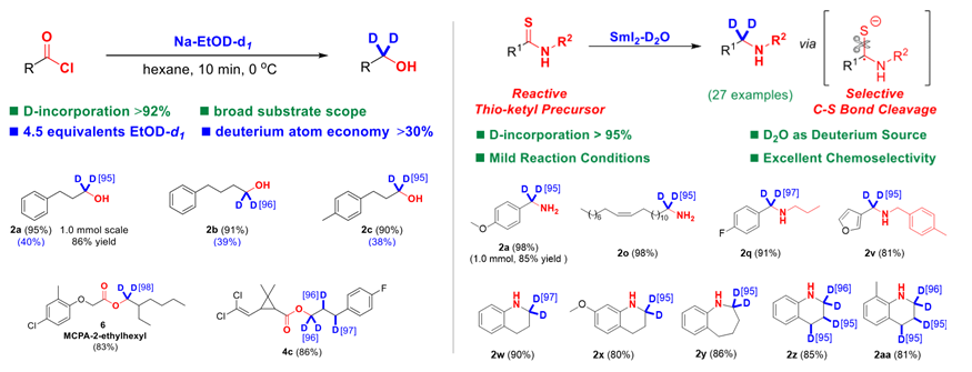 Deuterium is a non-radioactive stable isotope of hydrogen. Deuterium-labeled compounds can be used as isotopic internal standards in pesticide residue detection and as isotopic probe molecules in metabolic and toxicological studies, as well as in the elucidation of biosynthetic pathways. In particular, the introduction of deuterium atoms into drug molecules can improve pharmacokinetic properties, reduce metabolic toxicity, and stabilize drug conformations. Similarly, deuterium-labeled pesticides may extend their half-life, thereby reducing the application amount and frequency, achieving reduced application and increased efficiency; they may also reduce toxicity to non-target organisms by altering metabolic properties. The synthesis method of deuterium-labeled compounds is a major limiting factor for their research and application. The research and development team for botanical pesticides first established a synthesis method for deuterated alcohol compounds based on a novel single-electron transfer reductive deuteration strategy (Organic Letters 2024, 26, 3, 719-723). This method utilizes economical and inexpensive sodium dispersions as electron donors and deuterated ethanol as the deuterium source to achieve selective and efficient synthesis of dideuterated and polydeuterated alcohols, with a deuteration rate of >92% and high atom economy, meeting the needs for application in pesticide science. Furthermore, using inexpensive and readily available thioamides as active precursors, mild samarium diiodide as the reductant, and heavy water as the deuterium source, the team achieved efficient synthesis of dideuterated amine compounds (Organic Letters 2024, https://doi.org/10.1021/acs.orglett.4c03434). This method has a broad substrate scope and can be applied to the synthesis of primary or secondary aromatic or aliphatic deuterated amines, with high regioselectivity and a deuteration rate of >95%. Additionally, this method has been proven to be applicable to the synthesis of deuterated azaheterocyclic compounds, including six- and seven-membered rings, especially tetrahydroquinolines, which are important fragments of agriculturally active molecules. Different numbers and positions of deuterium can be introduced using this method. As key building blocks for pesticide synthesis, the establishment of the aforementioned methods will promote the research and application of deuterated compounds in pesticide science.