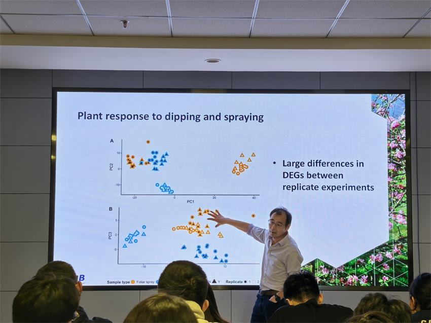 Professor Xu delivered an academic report titled "Rice Responses to the Use of Trichoderma" to our faculty and students. Taking the biological control of rice blast disease in Africa by Trichoderma as a starting point, he introduced in detail how, during the research process, it was found that the biological control agent had a minor impact on rice blast but had a significant effect on increasing rice yields in Africa. He further explored and analyzed the reasons why rice responds to the infection of biological control agents by increasing its yield. During the Q&A session, faculty, students, and Professor Xu engaged in in-depth discussions.