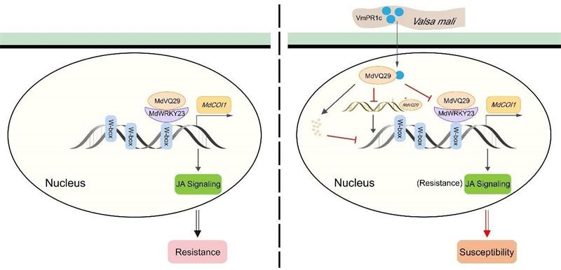 In this study, the target protein valine-glutamine (VQ) protein MdVQ29 of VmPR1c in apple was screened. The transgenic apple plants overexpressing MdVQ29 had significantly improved resistance to apple tree canker compared with the wild type. Further studies found that MdVQ29 interacts with the transcription factor MdWRKY23, promoting the transcriptional activation activity of MdWRKY23 on the jasmonic acid signaling pathway-related gene MdCOI1, thereby activating the jasmonic acid signaling pathway to exert disease resistance function. At the same time, the study also found that VmPR1c can inhibit the transcriptional activation activity of MdVQ29-mediated MdWRKY23 by promoting the degradation of MdVQ29, inhibiting the expression of MdVQ29, and inhibiting the interaction between MdVQ29 and MdWRKY23, thereby interfering with the host jasmonic acid signaling pathway and promoting the infection of V. mali. This study provides important genetic resources and theoretical basis for apple disease-resistant breeding, which has both scientific significance and potential production application value.