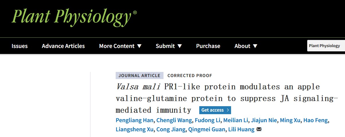 Recently, the research team from our college published a research paper titled “Valsa mali PR1-like protein modulates an Apple valine-glutamine protein to suppress JA signaling-mediated immunity” in the journal Plant Physiology. This study reveals the molecular mechanism of the key effector protein VmPR1c of apple tree canker pathogen to interfere with host immune response by targeting apple VQ protein MdVQ29, and then promote the infection of the canker pathogen.