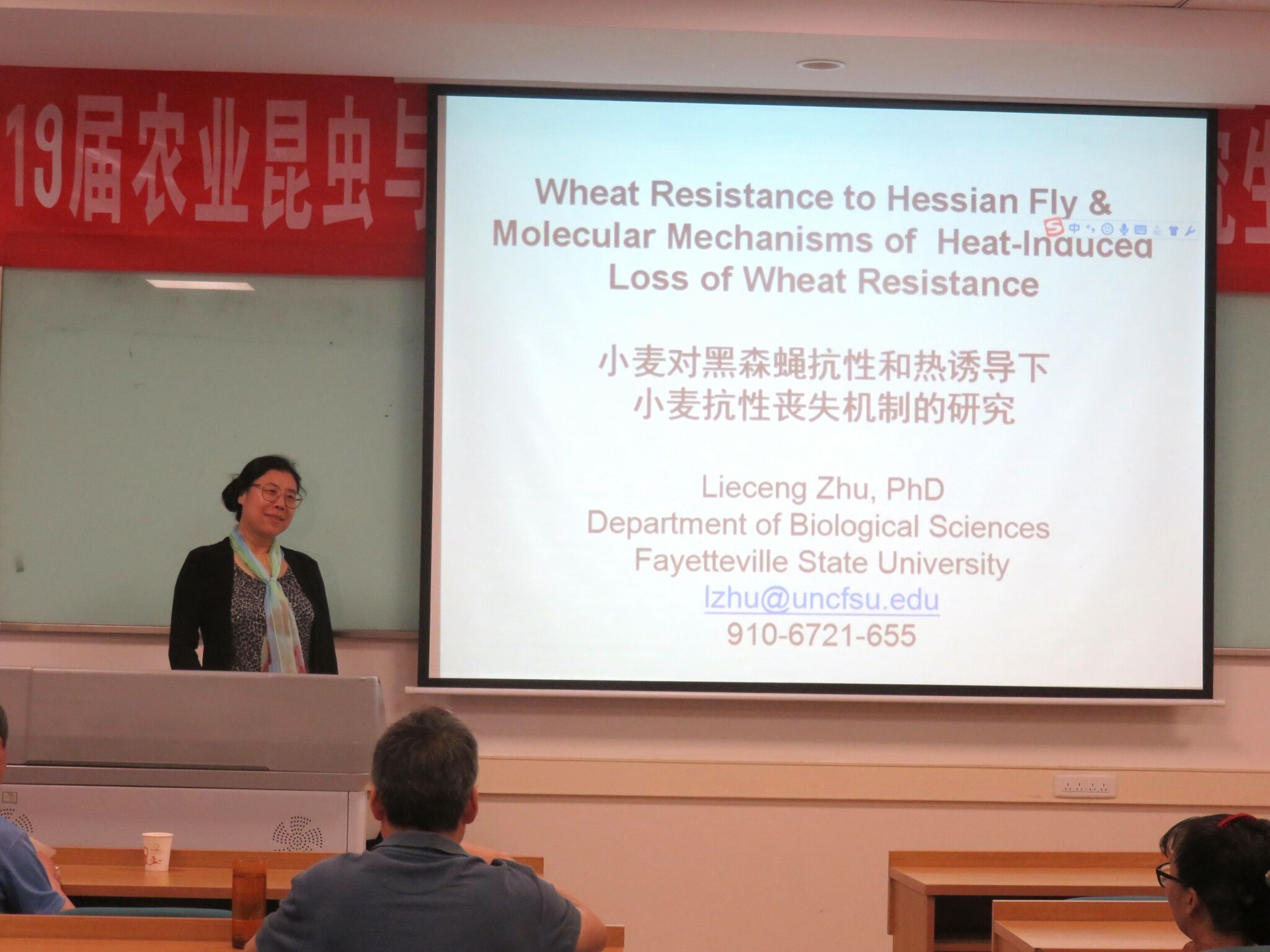 报告会上,朱列层教授首先简要介绍了美国费耶特维尔州立大学的教学模式,之后就小麦对黑森瘿蚊的抗性及高温诱导条件下小麦抗性丧失的机制进行了重点介绍。报告反映热烈,与会师生与朱教授进行了深入的讨论和交流。大家纷纷表示受益匪浅,特别是朱教授介绍的实用的实验技巧让同学们收获颇丰。