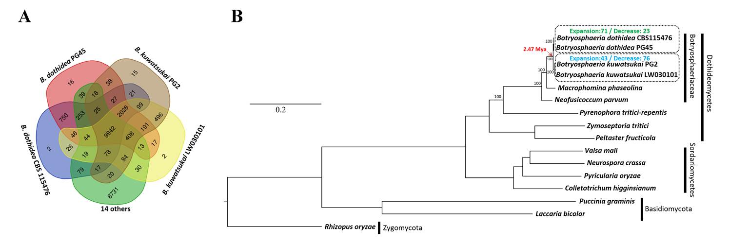 论文信息:Bo Wang , Xiaofei Liang, Mark L. Gleason, Rong Zhang, and Guangyu Sun. Comparative genomics of Botryosphaeria dothidea and B. kuwatsukai, causal agents of apple ring rot, reveals both species expansion of pathogenicity-related genes and variations in virulence gene content during speciation. IMA Fungus, 2018, 9(2): 243-257.