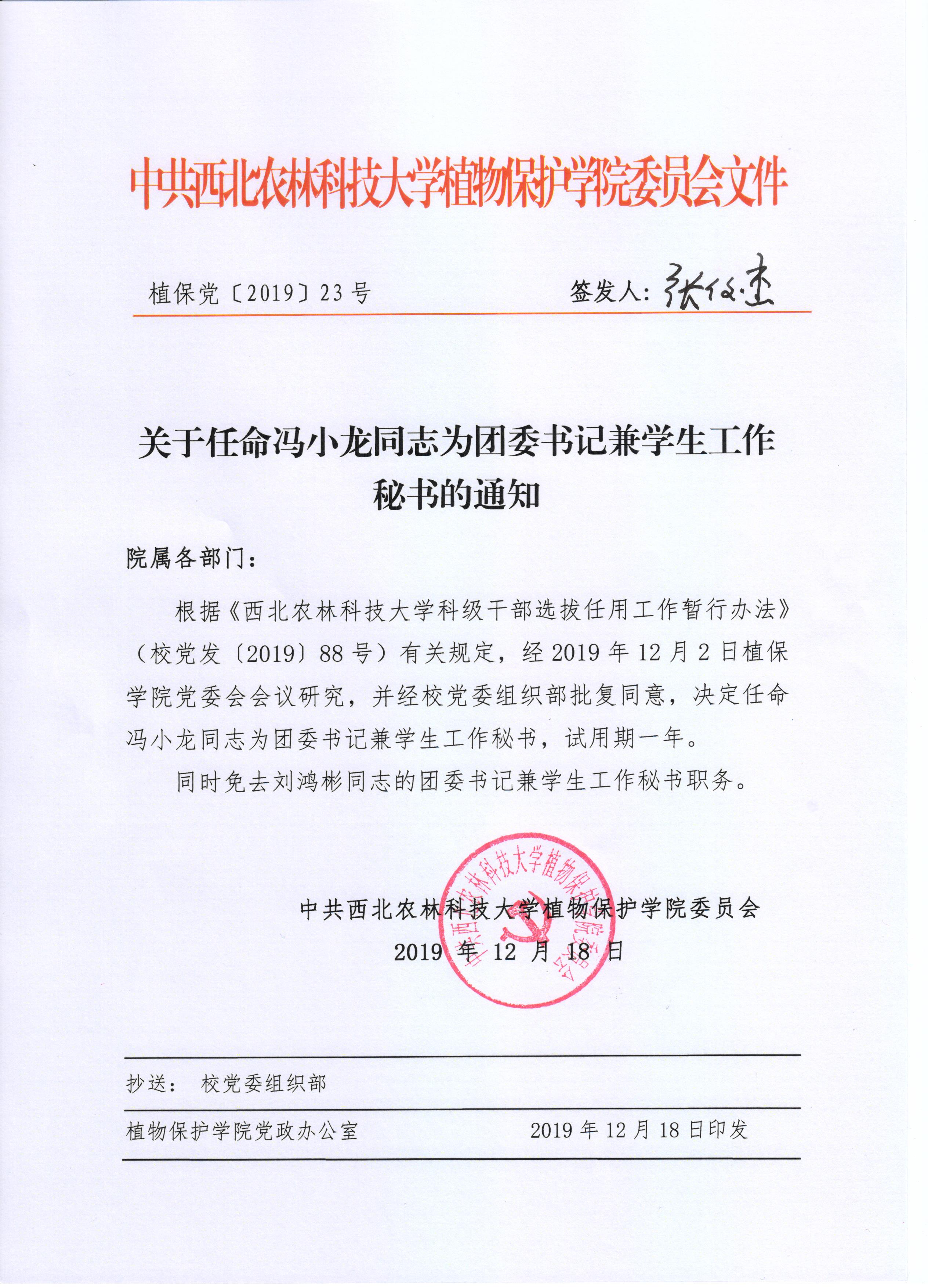 植保党〔2019〕年23号关于任命冯小龙同志为团委书记兼员工工作秘书的通知